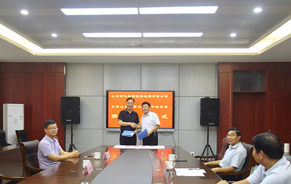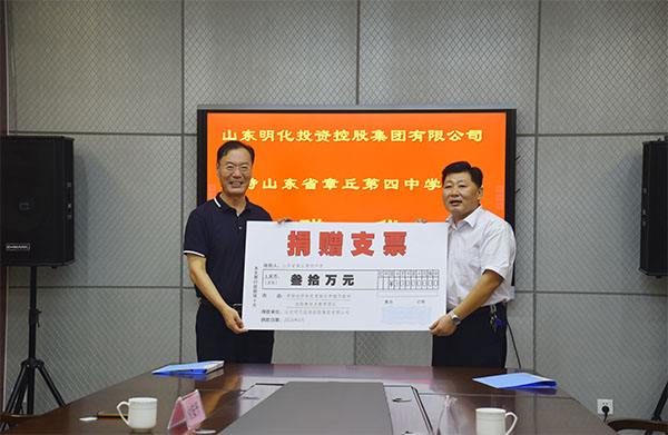 8月20日上午,明化集团支持章丘第四中学办学捐赠仪式在章丘四中举行。集团董事长孙洪海、集团副总经济师付安平,章丘四中校长刘清涛、党总支书记张勇、副校长李承刚、韩颖师等参加仪式。