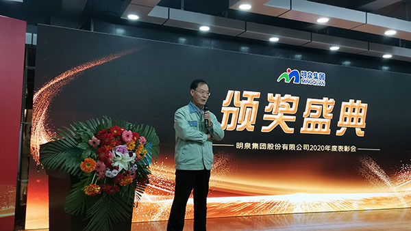 与会人员共同观看了集团年度回顾视频《雄关漫道真如铁 而今迈步从头越》,集团总裁孙志田宣读了《明泉集团关于表彰2020年度优秀集体、优秀个人的决定》。集团党委书记、董事长孙洪海,总裁孙志田,董事殷传光、仇健、郭彦超、彭建军、王胜利,集团监事会主席高建平,监事朱卫、孙庆利,明化公司财务总监高行川分别为集团2020度先模致颁奖词并颁奖。