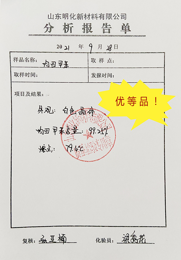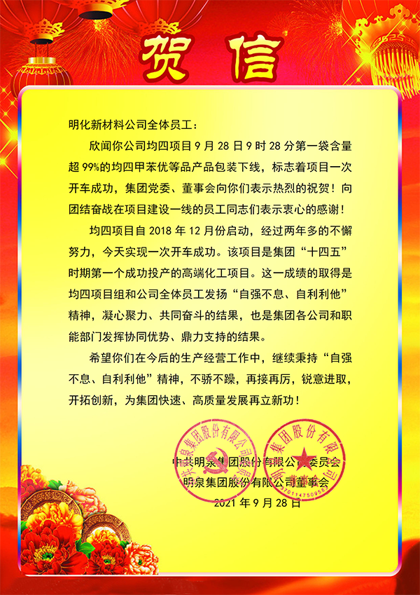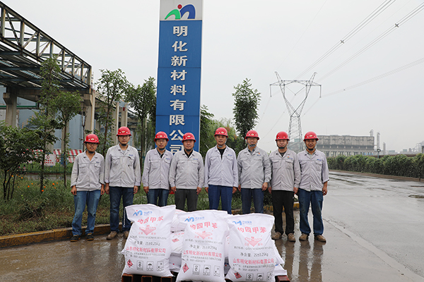 2021年9月28日上午9:28,第一袋均四甲苯合格产品承载着明泉人的殷切期盼,顺利完成包装下线,标志着明化新材料公司均四甲苯项目一次开车成功。