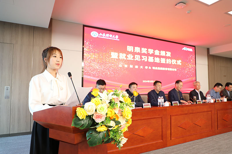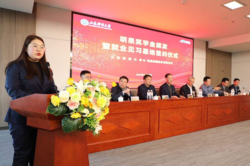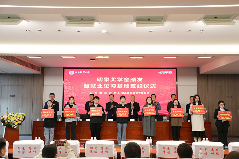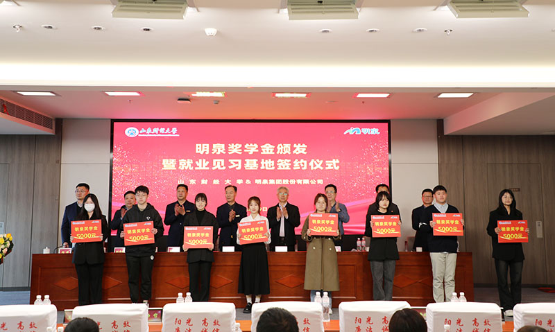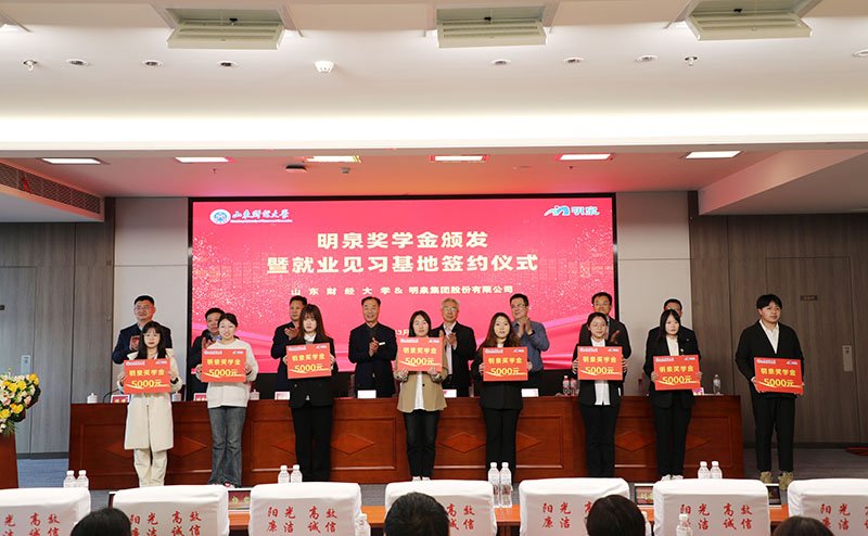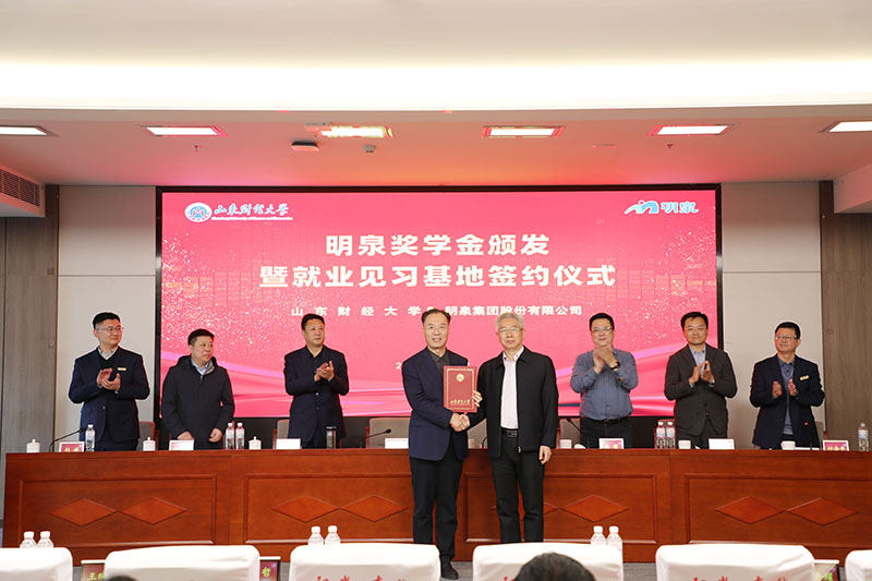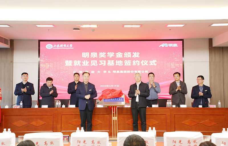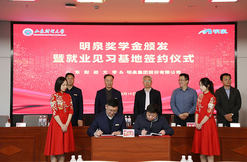 3月19日下午,“校企合作促发展,协同育人谱新篇”明泉奖学金颁发暨就业见习基地签约仪式在明泉大厦二楼多功能会议室举行。山东财经大学副校长张新、党委学生工作部部长杨哲、就业指导处处长刘奇耀、团委书记王晓迪,明泉集团党委书记、董事局主席孙洪海,党委副书记彭建军、人力资源中心主任刘洋、集团董事局办公室副主任付安平出席仪式。山东财经大学师生、明泉青年员工代表参加仪式。