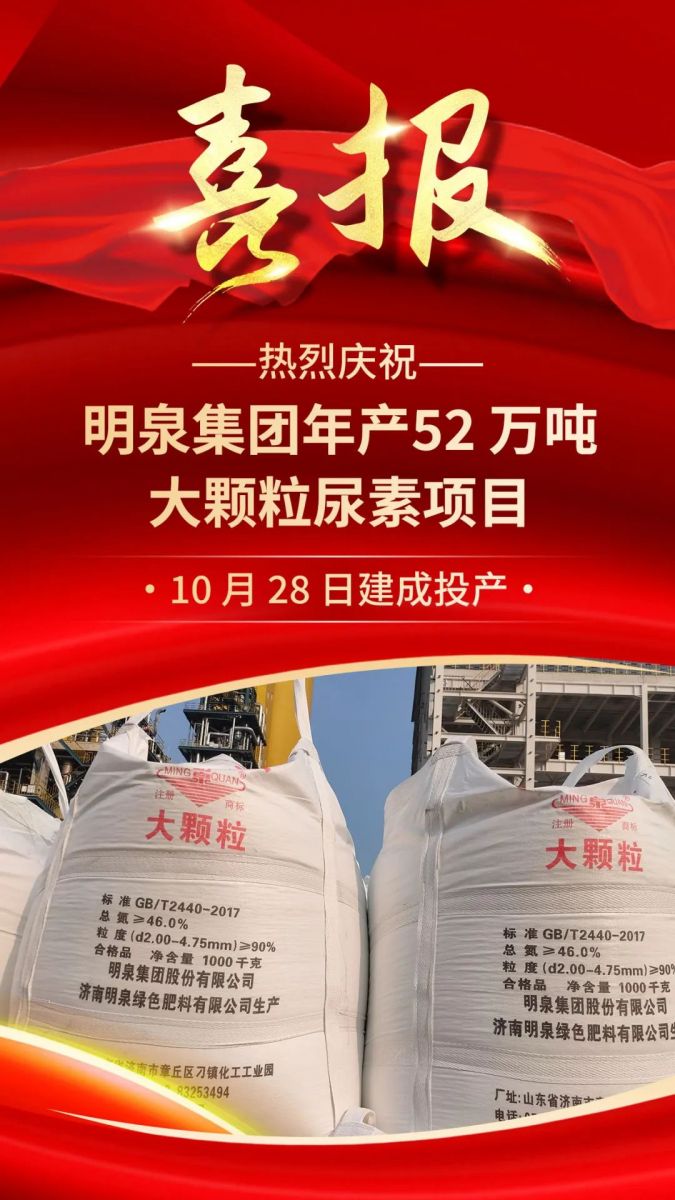 10月28日,明泉集团年产52万吨大颗粒尿素项目建成投产并产出合格产品。
