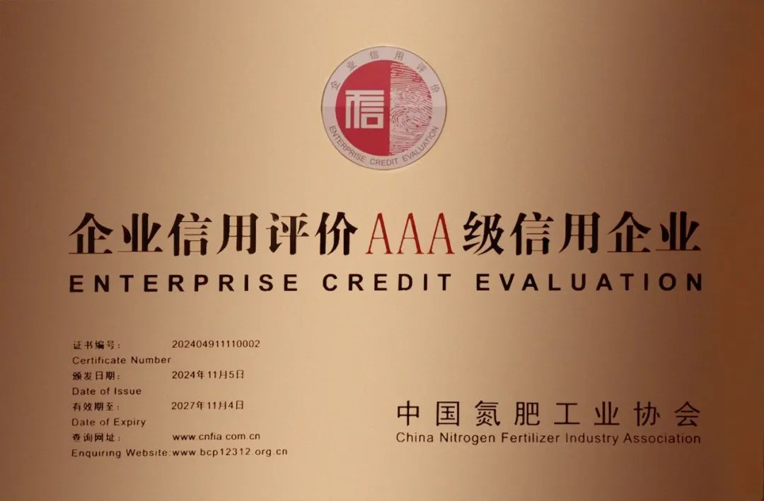 中国氨肥工业协会于2024年4月组织开展了氨肥、甲醇行业企业信用等级评价工作(第五批),由第三方机构对企业信用情况进行测评。经过第三方机构与协会行业信用评价专家的综合评审,共有明泉集团有限公司等五家企业获得AAA级信用等级。