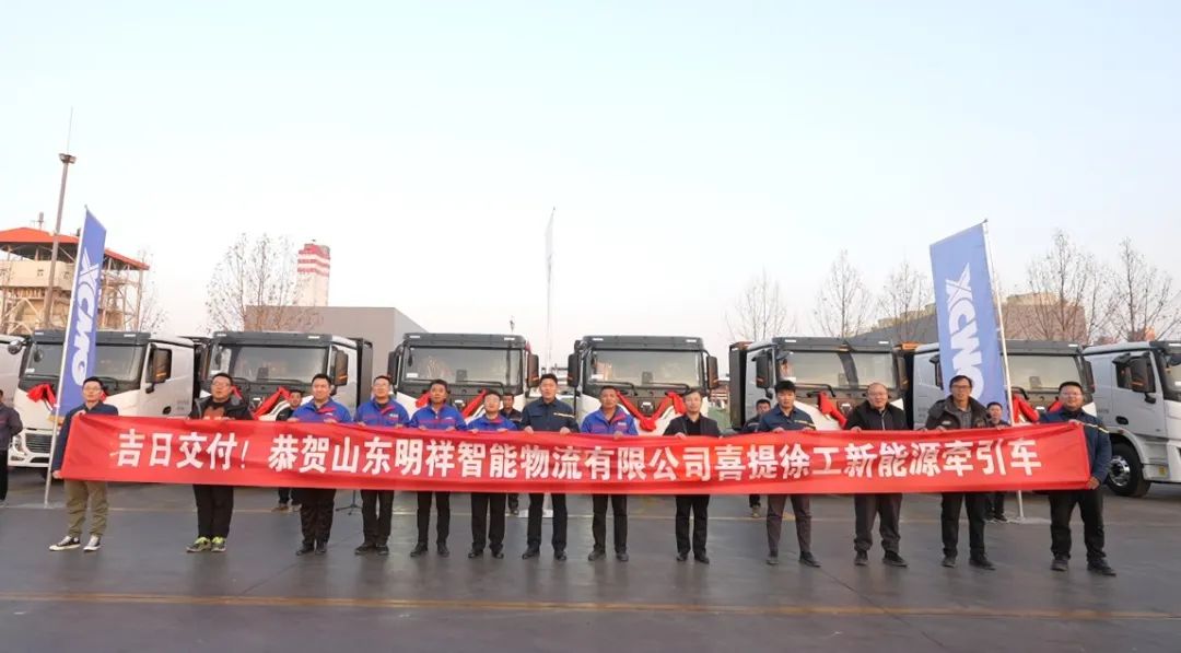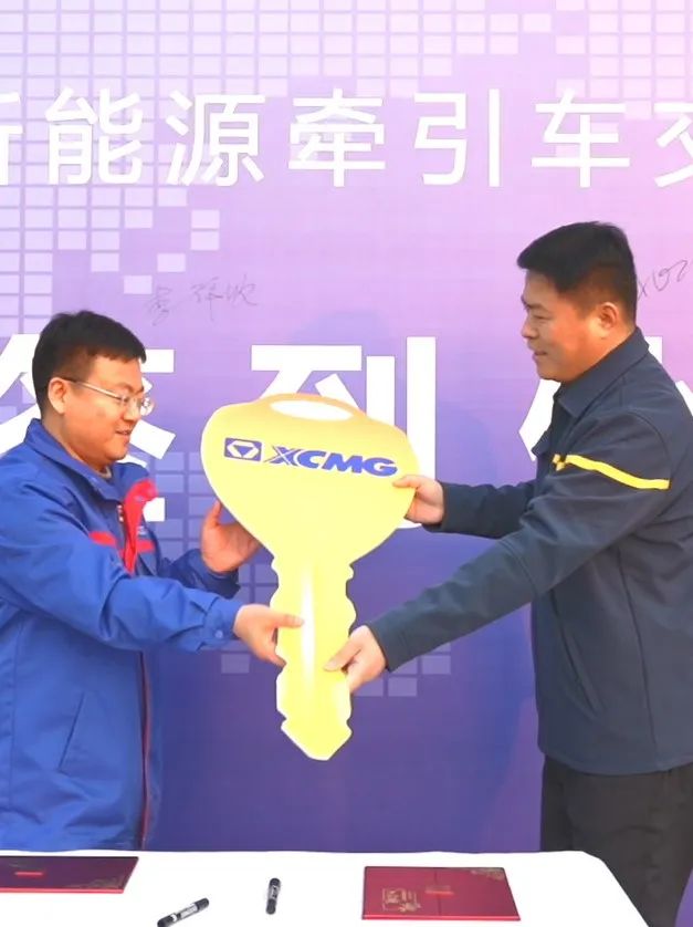 明泉集团明秀云智能物流公司董事长李祥收与徐工汽车公司销售总监于兆全进行车辆交付。