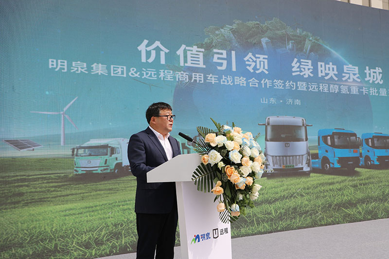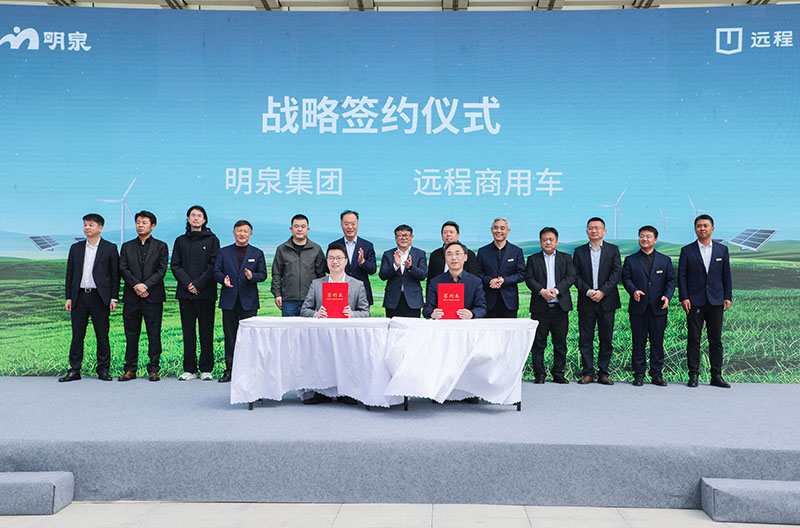 签约环节:明泉集团董事局副主席李光与远程商用车重卡营销公司副总经理岳海浪签署战略协议,双方将在绿色甲醇应用、新能源重卡推广等领域深化合作。