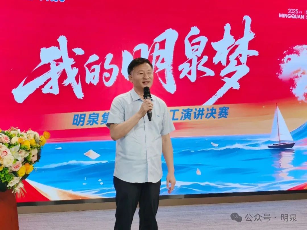 高建平对所有参赛选手的出色表现表示祝贺。他讲道,此次演讲比赛不仅是演讲技巧上的竞技,更是青年力量的展示、明泉精神的传承、思想共识的凝聚,活动充分体现了明泉新一代青年人朝气蓬勃、阳光自信的良好精神风貌。希望明泉所有青年员工以此次活动为起点,将演讲的激情转化为实干的动力,以“明泉人四项修炼”为行为准则,以中华优秀传统文化为精神指引,在集团二次转型的新征程中不断锤炼精神品格、努力增长才干、提升思想认知,为打造明泉第二增长曲线贡献青年力量,最终实现我们共同的“明泉梦”。
