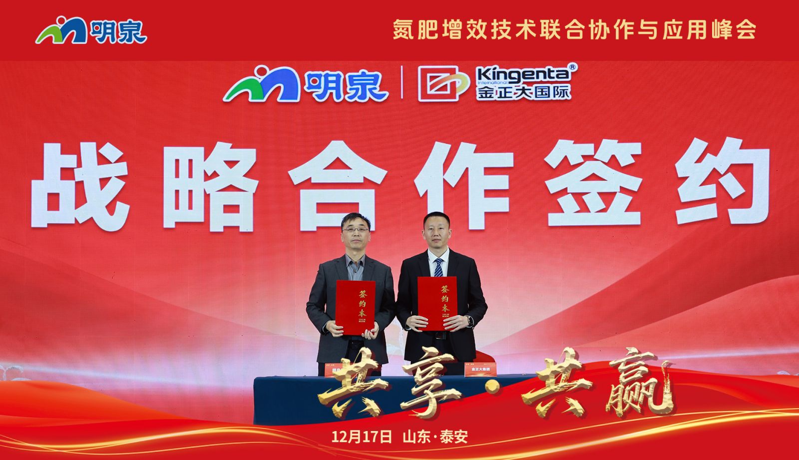 12月17日,在“共享·共赢——氮肥增效技术联合协作与应用峰会”现场,明泉集团与金正大生态工程集团签署新型增效尿素战略合作框架协议。