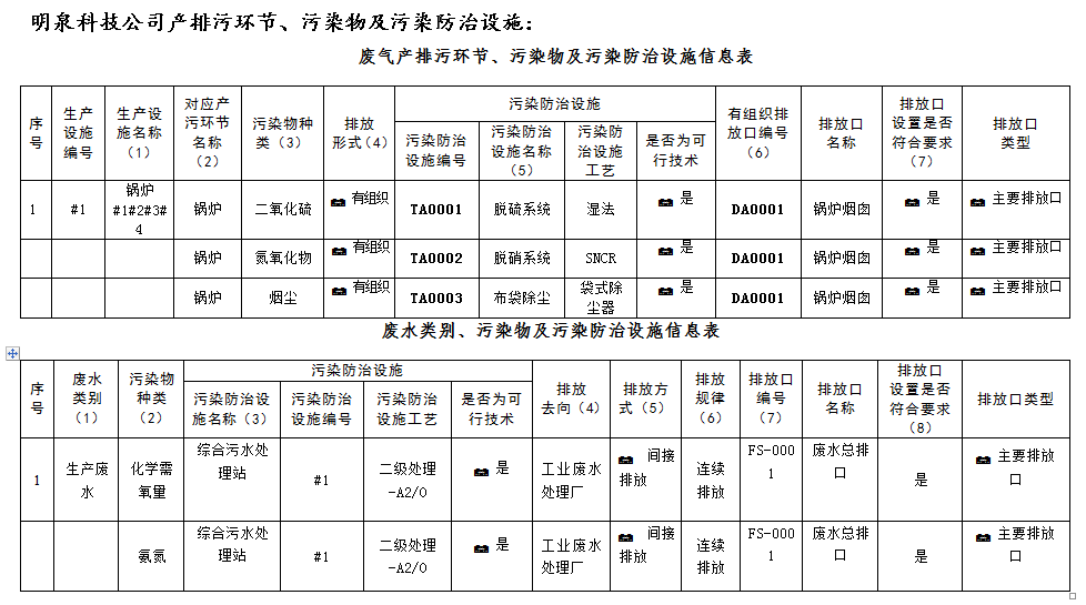 明泉科技有限公司废气产排污环节、污染物及污染防治设施信息表