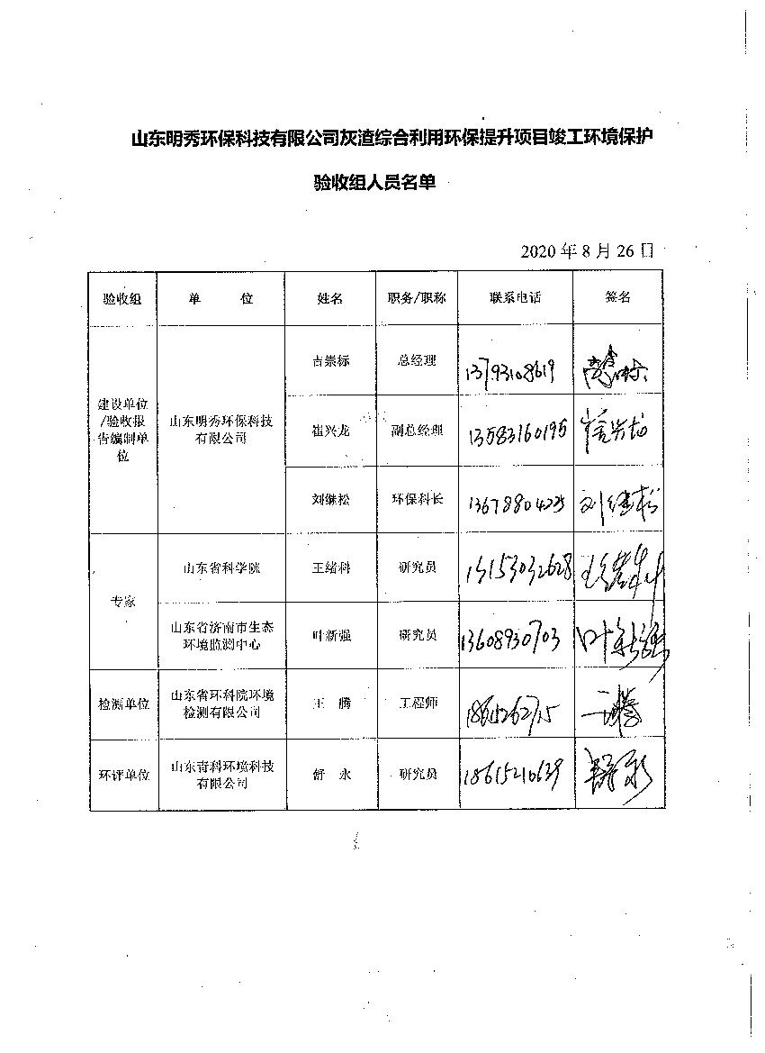 山东明秀环保科技有限公司灰渣综合利用环保提升项目竣工环境保护验收组人员名单